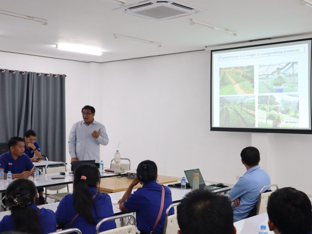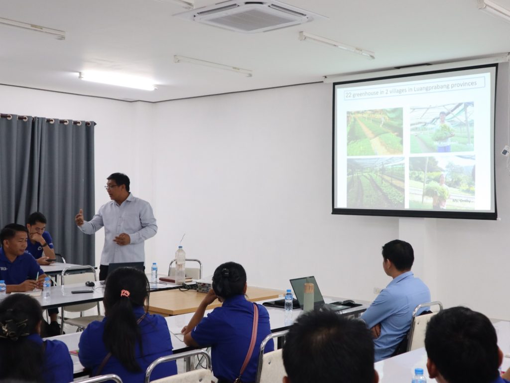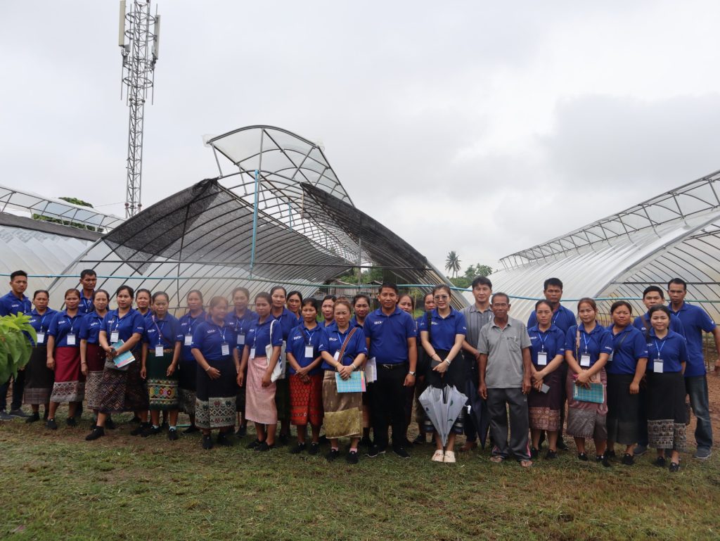 ໃນຕອນເຊົ້າຂອງວັນທີ 23/05/2024 ທີ່ຜ່ານມານີ້ ທີ່ສູນຄົ້ນຄວ້າພືດຜັກ ແລະ ໄມ້ໃຫ້ໝາກ (ສຜໝ) ໄດ້ຮັບກຽດຕ້ອນຮັບທີມງານຈາກສູນຝຶກອົບຮົມເຕັກນິກກະສິກໍາ ແລະ ພັດທະນາຊົນນະບົດ ລາວ-ເກົາຫຼີ ເຊິ່ງໄດ້ນໍາພາຊາວກະສິກອນ ຈາກ 3 ແຂວງຄື: ແຂວງຊຽງຂວາງ, ແຂວງວຽງຈັນ ແລະ ແຂວງບໍລິຄໍາໄຊ ຈໍານວນ 33 ທ່ານ ທີ່ລົງມາທັດສະນະສຶກສາ ແລະ ແລກປ່ຽນບົດຮຽນພາກສະໜາມ ໂດຍການຕ້ອນຮັບຢ່າງອົບອຸ່ນ ແລະ ເປັນກັນເອງ ຂອງທ່ານ ປອ ທອງຄູນ ສີສະໄພທອງ ຫົວໜ້າສູນຄົ້ນຄວ້າພືດຜັກ ແລະ ໄມ້ໃຫ້ໝາກ ພ້ອມດ້ວຍນັກວິຊາການຂອງສູນຄົ້ນຄວ້າພືດຜັກ ແລະ ໄມ້ໃຫ້ໝາກຈໍານວນໜຶ່ງເຂົ້າຮ່ວມ. ຈຸດປະສົງ: 1). ເພື່ອແລກປ່ຽນ ແລະ ຖ່າຍທອດບົດຮຽນ ທາງດ້ານຜົນສໍາເລັດຂອງການຈັດຕັ້ງປະຕິບັດການຄົ້ນຄວ້າທົດລອງ ໂດຍສະເພາະການຄົ້ນຄວ້າທາງດ້ານການປັບຕົວເຂົ້າກັບການປ່ຽນແປງດິນຟ້າອາກາດຂອງການຜະລິດພືດຜັກພ້ອມທັງການປ້ອງກັນພະ ຍາດແມງໄມ້ສັດຕູພືດ ແລະ ການແປຮູບຜະລິດຕະພັນກະສິກໍາ.