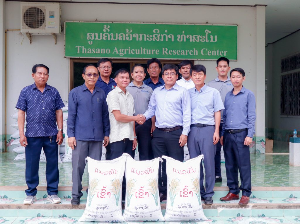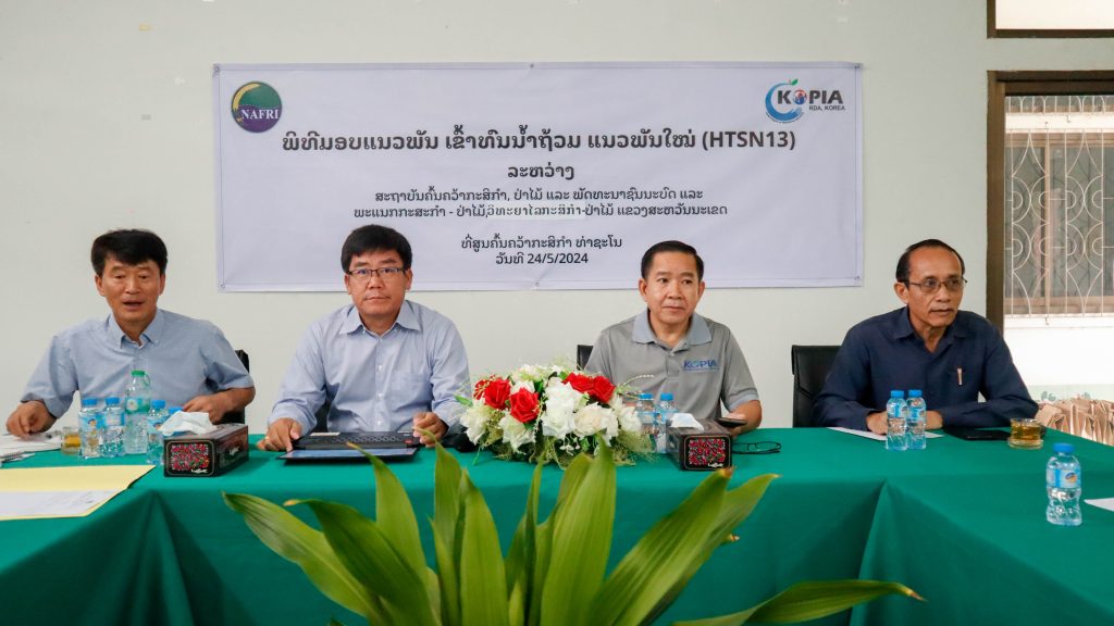 ໃນວັນທີ 24 ພຶດສະພາ 2024, ສະຖາບັນຄົ້ນຄວ້າກະສິກໍາ, ປ່າໄມ້ ແລະ ພັດທະນາຊົນນະບົດ ໄດ້ມອບແນວພັນເຂົ້າ ໃຫ້ແກ່ພະແນກກະສິກໍາ ແລະ ປ່າໄມ້ແຂວງ, ວິທະຍາໄລກະສິກໍາ – ປ່າໄມ້ ແຂວງສະຫວັນນະເຂດ ແລະ ສູນຄົ້ນຄວ້າກະສິກຳທ່າສະໂນ. ພິທີຈັດຂຶ້ນຢູ່ສູນຄົ້ນຄວ້າກະສິກໍາທ່າສະໂນ, ບ້ານທ່າສະໂນ, ແຂວງສະຫວັນນະເຂດ ໂດຍການເຂົ້າຮ່ວມເປັນປະທານຮ່ວມຂອງ ທ່ານ ບຸນທະວີ ໄຊຍະເພັດ ຫົວໜ້າກົມຈັດຕັ້ງ ແລະ ພະນັກງານ ກະຊວງກະສິກຳ ແລະ ປ່າໄມ້, ທ່ານ ປອ ເພັດມະນີແສງ ຊ້າງໄຊຍະສານ ຮອງຫົວໜ້າສະຖາບັນຄົ້ນຄວ້າກະສິກໍາ, ປ່າໄມ້ ແລະ ພັດທະນາຊົນນະບົດ, ທ່ານ ຄວນ ໂດຮາ ຜູ້ອໍານວຍການສູນໂກເປຍ ປະຈໍາ ສປປ ລາວ(KOPIA), ທ່ານ ຄໍາມອນ ທິລາວົງ ຮອງຫົວຫນ້າພະແນກກະສິກຳ ແລະ ປ່າໄມ້ ແຂວງສະຫວັນນະເຂດ, ທ່ານ ຈໍາປາທອງ ທໍາມະວົງ ອໍານວນການວິທະຍາໄລກະສິກຳ ແລະ ປ່າໄມ້ ແຂວງສະຫວັນນາເຂດ. ມີທ່ານ ປອ.ພັນໄຊ ອີງໄຊ ຮອງຫົວໜ້າກົມສົ່ງເສີມກະສິກຳ ແລະ ສະຫະກອນ ກະຊວງກະສິກຳ ແລະ ປ່າໄມ້ ພ້ອມດ້ວຍຫົວໜ້າສູນ, ຮອງຫົວໜ້າສູນ ຄົ້ນຄວ້າກະສິກໍາທ່າສະໂນ ຕະຫຼອດຮອດນັກຄົ້ນຄວ້າ ແລະ ພະນັກງານວິຊາການຈາກພາກສ່ວນທີ່ກ່ຽວຂ້ອງເຂົ້າຮ່ວມ.