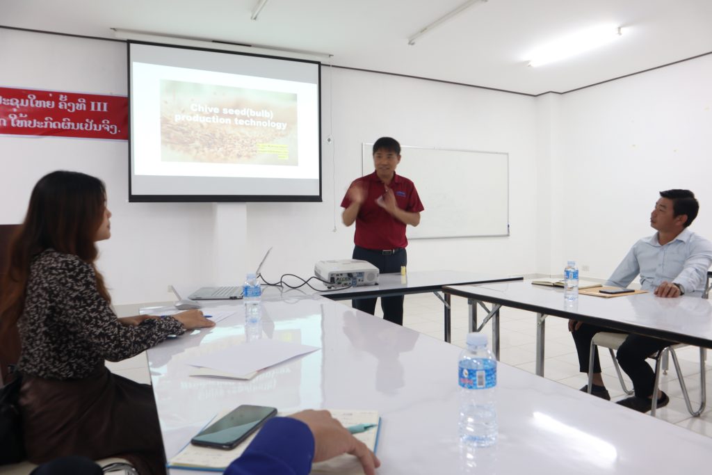 ໃນຕອນບ່າຍຂອງວັນທີ 7/1/2025 ທີ່ຜ່ານມາ ສູນຄົ້ນຄວ້າພືດຜັກ ແລະ ໄມ້ໃຫ້ໝາກ ຮ່ວມກັບໂຄງການສ້າງໂຕແບບການຜະລິດການເກັບຮັກສາ ແລະ ການຂະຫຍາຍແນວພັນຜັກບົ່ວແບ່ງ (KOPIA) ໄດ້ເຊີນຊ່ຽວຊານຈາກ ສ. ເກົາຫຼີ ເປີດການຝຶກອົບຮົມໃນຫົວຂໍ້ Chive seed (bulb) production technology ໃຫ້ແກ່ພະນັກງານວິຊາການຂອງສູນຄົ້ນຄວ້າພືດຜັກ ແລະ ໄມ້ໃຫ້ໝາກ ເຊິ່ງມີຜູ້ເຂົ້າຮ່ວມທັງໝົດ ຈໍານວນ 15 ທ່ານ ຈຸດປະສົງ: 1). ເພື່ອແລກປ່ຽນ ແລະ ຖ່າຍທອດບົດຮຽນກ່ຽວກັບເຕັກນິກການປູກ, ການເກັບຮັກສາແນວພັນຜັກຫອມບົ່ວ ແລະ ສະພາບແວດລ້ອມທີ່ເໝາະສົມສໍາລັບຜັກຫອມບົ່ວ