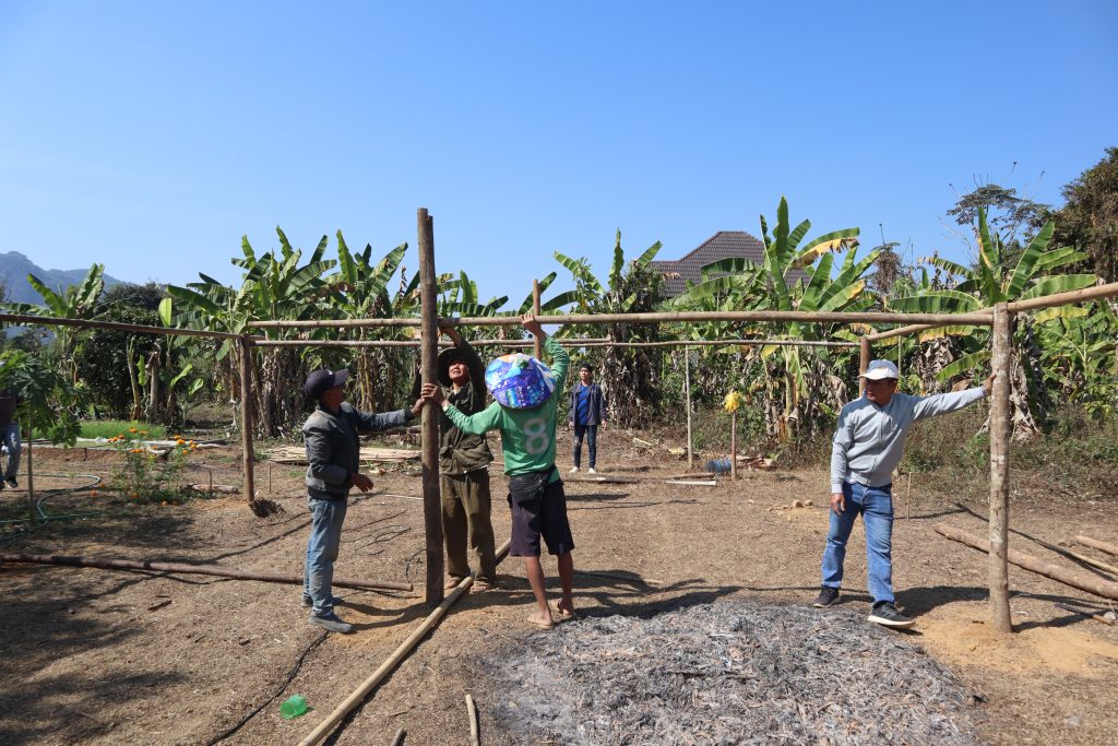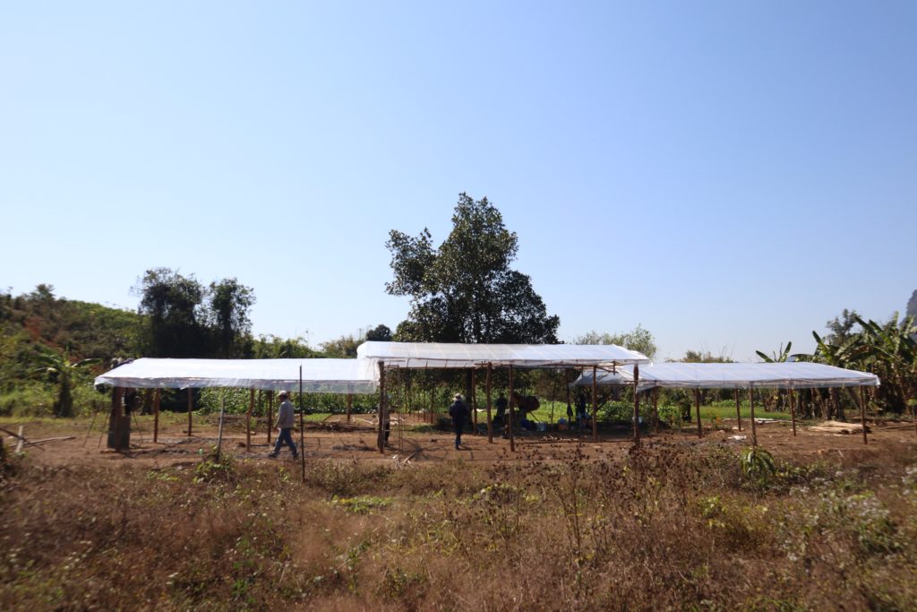 ການຈັດຕັ້ງປະຕິບັດໃນຄັ້ງນີ້ ທາງທີມງານຂອງ ສູນຄົ້ນຄວ້າພືດຜັກ ແລະ ໄມ້ໃຫ້ໝາກ ໄດ້ມີການນໍາເອົາລະບົບເຮືອນຮົ່ມທີ່ອອກແບບໂດຍ (ສຜໝ) ເອີ້ນວ່າ ແບບຕ່າງລະດັບ (Offset module) ຂະໜາດ 7×21 ແມັດ ເຊິ່ງແຕກຕ່າງຈາກລະບົບເຮືອນຮົ່ມທີ່ມີການນໍາໃຊ້ເຂົ້າໃນການປູກພືດຜັກທີ່ມີໃຫ້ເຫັນຢູ່ໃນຂອບເຂດທົ່ວປະເທດ, ເຮືອນຮົ່ມແບບຕ່າງລະດັບນີ້ ມີຈຸດພິເສດທີ່ດີເດັ່ນແຕກຕ່າງກັບເຮືອນຮົ່ມແບບອຶ່ນໆ ຄື: ອຸນຫະພູມສູງສຸດໂດຍສະເລ່ຍຢູ່ໃນເຮືອນຮົ່ມຈະສູງກວ່າຢູ່ພື້ນທີ່ເປີດ ພຽງແຕ່ 1 ອົງສາເຊ ເມື່ອທຽບໃສ່ເຮືອນຮົ່ມແບບອຶ່ນໆ ແມ່ນສູງກວ່າ 8 ອົງສາເຊ, ມີການລະບາຍອາກາດໄດ້ດີ, ເໝາະສົມຕໍ່ການຈະເລີນເຕີບໂຕຂອງພືດຜັກ ເຊິ່ງທີມງານແມ່ນໄດ້ນໍາພາ ແລະ ແນະນໍາຊາວກະສິກອນກ່ຽວກັບຂັ້ນຕອນ ແລະ ວິທີການໃນການປຸກສ້າງເຮືອນຮົ່ມແບບຕ່າງລະດັບ ເພື່ອໃຫ້ຊາວກະສິກອນສາມາດນໍາເອົາເຕັກນິກດັ່ງກ່າວໄປຜັນຂະຫຍາຍໃນອະນາຄົດ ນອກຈາກນັ້ນທາງທີມງານຍັງສາທິດການປົກຄຸມຜ້າກັນແສງ ຊ່ວງລະດູຝົນ ເພື່ອເປັນອີກໜຶ່ງທາງເລືອກສໍາລັບຊາວກະສິກອນຜູ້ທີ່ມີງົບປະມານຈໍາກັດ ເຊີ່ງການນໍາໃຊ້ຜ້າກັນແສງນີ້ສາມາດປ້ອງກັນການກະທົບຈາກຝົນໃສ່ຜັກໂດຍຕົງ ເພື່ອໃຫ້ຊາວກະສິກອນຍັງສາມາດເກັບກ່ຽວຜົນຜະລິດໄດ້.