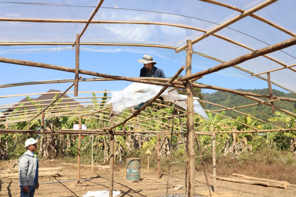 ໃນລະຫວ່າງວັນທີ 14-17 ທີ່ຜ່ານມານີ້ ສູນຄົ້ນຄວ້າພືດຜັກ ແລະ ໄມ້ໃຫ້ໝາກ (ສຜໝ), ສະຖາບັນຄົ້ນຄວ້າກະສິກໍາ, ປ່າໄມ້ ແລະ ພັດທະນາຊົນນະບົດ (ສກປພ) ຮ່ວມກັບໂຄງການສ້າງໂຕແບບໃນການຜະລິດ, ການເກັບຮັກສາ ແລະ ການຂະຫຍາຍແນວພັນຜັກບົ່ວແບ່ງ (KOPIA) ໄດ້ມີການສະໜັບສະໜູນທາງດ້ານວັດຖຸອຸປະກອນໃນການປຸກສ້າງເຮືອນຮົ່ມ ແລະ ສາທິດເຕັກນິກການປຸກສ້າງເຮືອນຮົ່ມ ຢູ່ພື້ນທີ່ຊາວກະສິກອນ ເຊິ່ງຈັດຕັ້ງຢູ່ທີ່ບ້ານຂັນໝາກ, ເມືອງວັງວຽງ, ແຂວງວຽງຈັນ ເຊິ່ງມີຜູ້ເຂົ້າຮ່ວມທັງໝົດ ຈໍານວນ 13 ຄົນ ຈຸດປະສົງ 1) ເພື່ອພັດທະນາດ້ານເຕັກນິກການປູກພືດຜັກ ໃນຊ່ວງລະດູຝົນ ເພື່ອເພິ່ມລາຍຮັບໃຫ້ແກ່ຊາວກະສິກອນ.