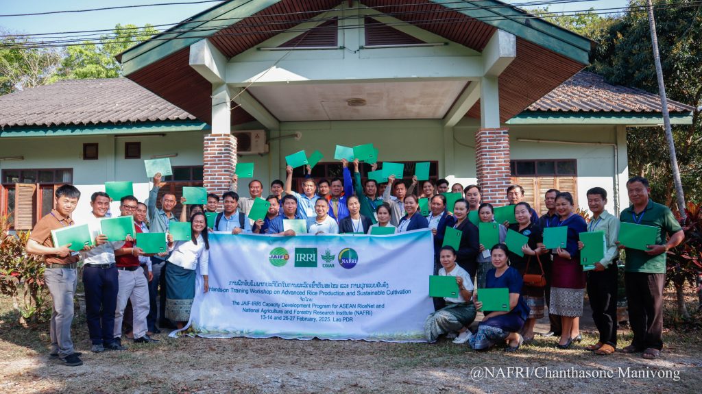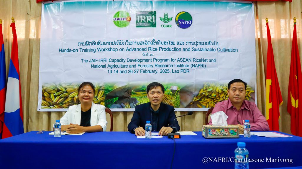 ໃນລະຫວ່າງ ວັນທີ 26-27 ກຸມພາ 2025 ນີ້, ທີ່ສູນຄົ້ນຄວ້າກະສິກຳເຂດເນີນສູງ, ບ້ານ ຫ້ວຍໂຄດ ເມືອງ ຊຽງເງິນ ແຂວງຫຼວງພະບາງ ໄດ້ມີພິທີເປີດຊຸດຝຶກອົບຮົມ ພາກປະຕິບັດການຜະລິດເຂົ້າທັນສະໄໜ ແລະ ການປູກແບບຢືນຍົງ, ໂດຍການເປັນປະທານຮ່ວມຂອງ ທ່ານ ປອ ສີວຽງແຂກ ພົມມະລາດ ຫົວໜ້າສູນຄົ້ນຄວ້າ ແລະ ພືດເສດຖະກິດ ກະຊວງ ກະສິກຳ ແລະ ປ່າໄມ້, ທ່ານ ຢີຢາງ ຮອງຫົວໜ້າພະແນກ ກະສິກຳ ແລະ ປ່າໄມ້ແຂວງຫຼວງພະບາງ, ທ່ານ ນາງ ສິລິພອນ ຈັນທະລາ ຫົວໜ້າຫ້ອງການຄົ້ນຄວ້າເຂົ້າສາກົນ ປະຈຳ ສປປ ລາວ IRRI, ມີທ່ານ ຄຳຫຼ້າ ພັນທະບູນ ຫົວໜ້າ ສູນຄົ້ນຄວ້າກະສິກຳ ເຂດເນີນສູງ, ທ່ານ ນ. ຄຳໄຕ ວົງໄຊຍາ ຮອງຫົວໜ້າສູນຄົ້ນຄວ້າເຂົ້າ ແລະ ພືດເສດຖະກິດ, ມີນັກສຳມະນາກອນ ຈາກ ຂະແໜງປູກຝັງ ພະແນກກະສິກຳ ແລະ ປ່າໄມ້ ແຂວງ ຫຼວງພະບາງ, ແຂວງ ອຸດົມໄຊ, ແຂວງ ໄຊຍະບູລີ, ແຂວງ ຊຽງຂວາງ, ທີມງານອາຈານຈາກ ມະຫາວິທະຍາໄລສຸພານຸວົງ, ທີມງານຈາກຫ້ອງການກະສິກຳ ແລະ ປ່າໄມ້ ເມືອງຊຽງເງິນ, ເມືອງນານ, ທີມວິຊາການຈາກສູນຄົ້ນຄວ້າກະສິກຳຫຼວງນໍ້າທາ, ທີມງານສູນຄົ້ນຄວ້າກະສິກຳເຂດເນີນສູງ, ກຸ່ມຊາວນາຜູ້ຜະລິດເຂົ້າ ຈາກບ້ານໃກ້ຄຽງ ເຂດເມືອງນານ ແລະ ເມືອງຊຽງເງິນ ແລະ ທີມງານຄູຝຶກທີ່ມາຈາກ ສູນຄົ້ນຄວ້າເຂົ້າ ແລະ ພືດເສດຖະກິດ ແລະ ຜູ້ຕາງໜ້າຈາກໂຄງການພັດທະນາຄວາມສາມາດກອງທຶນການເຊື່ອມໂຍງຍີ່ປຸ່ນ-ອາຊຽນສໍາລັບເຄືອຄ່າຍເຂົ້າອາຊຽນ ອີຣີ ລວມທັງໝົດ 45 ທ່ານ ຍິງ 12 ທ່ານ.