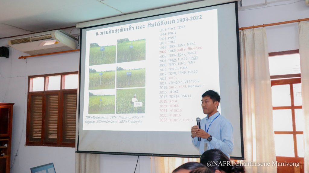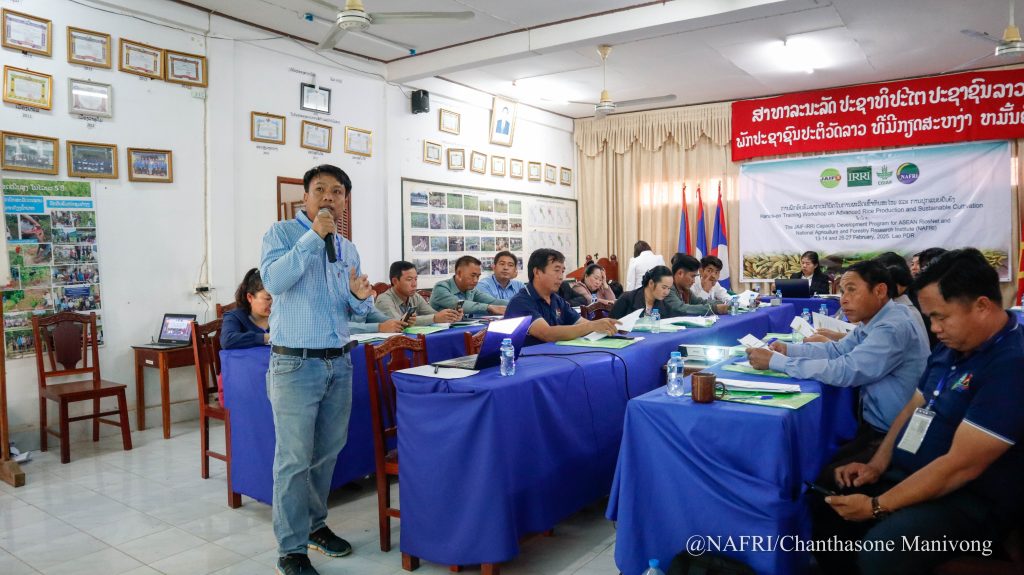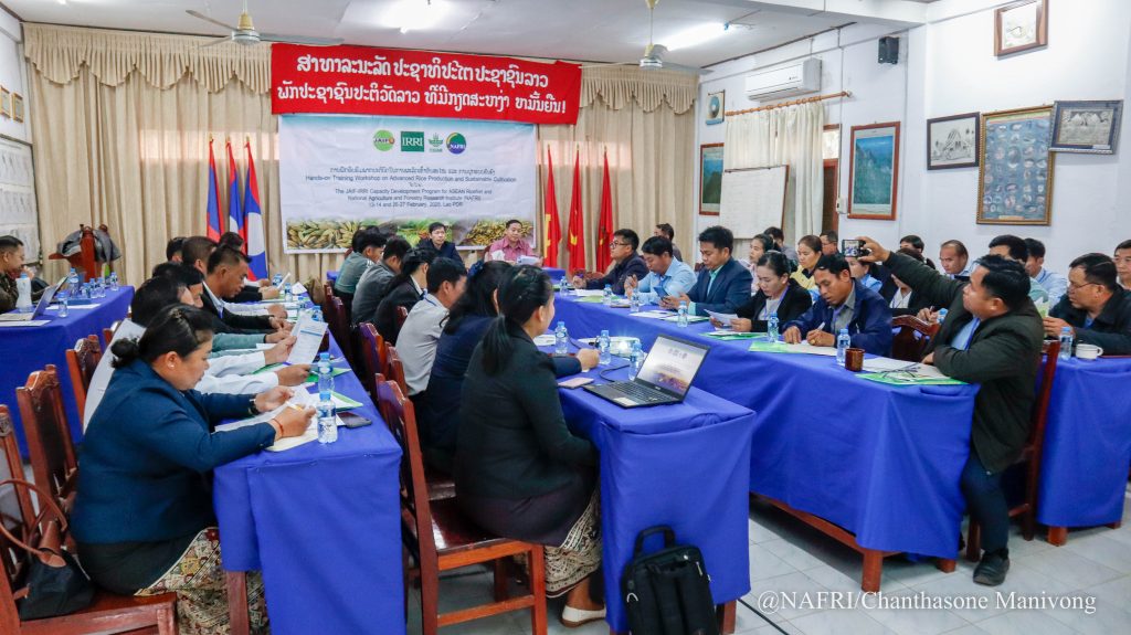 ກອງປະຊຸມໄດດຳເນີນເປັນເວລາ 2ມື້ ເຊິ່ງມື້ທີ 1 ແມ່ນຈະໄດ້ຮຽນຮູ້ ແລະ ທຳຄວາມເຂົ້າໃຈກ່ຽວກັບສະພາບການປ່ຽນແປງຂອງດິນຟ້າອາກາດທີ່ມີຜົນກະທົບຕໍ່ການປູກເຂົ້າ, ຮຽນຮູ້ກ່ຽວກັບນິເວດຂອງການຜະລິດເຂົ້າໃນລາວເຮົາ, ຮຽນຮູ້ຫຼັກການໃນການຈັດການສັດຕູພືດແບບປະສົມປະສານ, ການກະກຽມແຜນການປູກ ແລະ ເຕັກນິກການປູກເຂົ້າ. ແລະ ມື້ທີ 2 ເປັນການຝຶກໂດຍເນັ້ນໃສ່ບັນດາເຕັກນິກຕ່າງໆເຊັ່ນ: ເຕັກນິກການຈັດການນ້ຳ, ຝຸ່ນ, ແມງໄມ້ສັດຕູພືດ, ເຕັກນິກການເຮັດນາຢອດ-ນາຫວ່ານ, ເຕັກນິກການເກັບກ່ຽວ, ວິທະຍາການຫຼັງເກັບກ່ຽວ ນອກຈາກນີ້ຍັງໄດ້ຮຽນຮູ້ກ່ຽວກັບເຕັກນິກການປູກພືດເສດຖະກິດເຊັ່ນ: ສາລີ, ຖົ່ວ ແລະ ມັນຕົ້ນອີກດ້ວຍ.