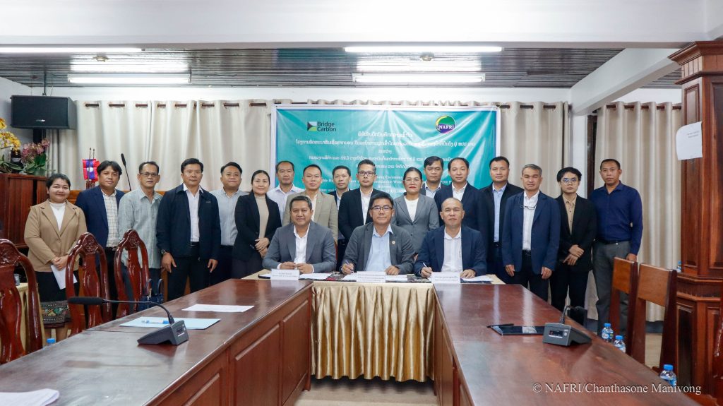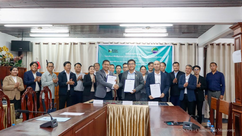 ໃນຕອນບ່າຍວັນທີ 1 ກໍລະກົດ 2025 ທີ່ຫ້ອງປະຊຸມນ້ອຍ ສະຖາບັນຄົ້ນຄວ້າກະສິກຳ, ປ່າໄມ້ ແລະ ພັດທະນາຊົນນະບົດ ໄດ້ຈັດພິທີເຊັນບົດບັນທຶກຄວາມເຂົ້າໃຈ ໂຄງການ ພັດທະນາສິນເຊື່ອກາກບອນ ໃນລະບົບການປຸກເຂົ້າ ໂດຍຜ່ານລະບົບການຄຸ້ມຄອງນໍ້າທີ່ຍືນຍົງ ຢູ່ ສປປ ລາວ ລະຫວ່າງ ກະຊວງກະສິກໍາ ແລະ ສິ່ງແວດລ້ອມ ຕາງໜ້າໂດຍ ສະຖາບັນຄົ້ນຄວ້າກະສິກຳ, ປ່າໄມ້ ແລະ ພັດທະນາຊົນນະບົດ ເຊັນໂດຍ ທ່ານ ປອ ເພັດມະນີແສງ ຊ້າງໄຊຍະສານ ຮັກສາການຫົວໜ້າ ສະຖາບັນຄົ້ນຄວ້າກະສິກຳ, ປ່າໄມ້ ແລະ ພັດທະນາຊົນນະບົດ, ຮ່ວມກັບ ບໍລິສັດ ບຣິດ ຄາບອນ ລາວ ຈໍາກັດຜູ້ດຽວ, ເຊັນໂດຍ ທ່ານ ສັນຕິ ອິນທະວົງຜູ້ອຳນວຍການ ບໍລິສັດ ບຣິດ ຄາບອນ ລາວ ຈໍາກັດຜູ້ດຽວ ແລະ ທ່ານ ປອ ບຸນເດດ ສຸດທະວີໄຊ ຫົວໜ້າກົມແຜນການ ແລະ ການຮ່ວມມື, ມີທ່ານ ຫົວໜ້າ/ຮອງຫ້ອງການ ກະຊວງກະສິກຳ ແລະ ສິ່ງແວດລ້ອມ, ມີຫົວໜ້າ/ຮອງ ສະຖາບັນ, ຫົວໜ້າ/ຮອງກົມອ້ອມຂ້າງກະຊວງກະສິກຳ ແລະ ສິ່ງແວດລ້ອມ ແລະ ບໍລິສັດ ບຣິດ ຄາບອນ ລາວ ຈໍາກັດຜູ້ດຽວ ເຂົ້າຮ່ວມເປັນສັກຂີພິຍານ.