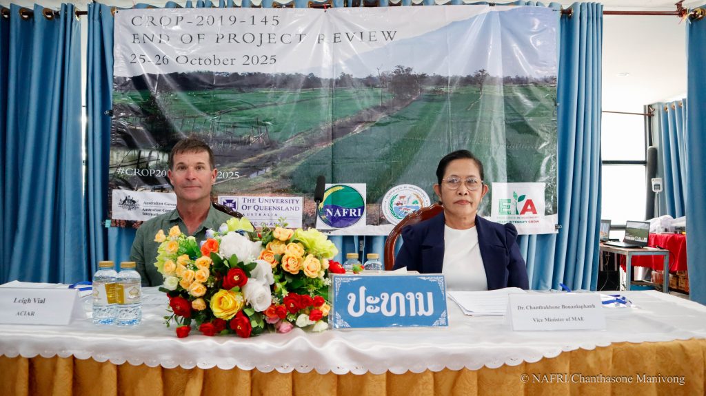 ໃນລະຫວ່າງວັນທີ 25-26 ຕຸລາ 2025 ສະຖາບັນຄົ້ນຄວ້າກະສິກຳ, ປ່າໄມ້ ແລະ ພັດທະນາຊົນນະບົດ, ກະຊວງກະສິກຳ ແລະ ສິ່ງແວດລ້ອມ ໄດຈັດກອງປະຊຸມ ກ່ຽວກັບເຕັກນິກການຄຸ້ມຄອງວັດຊະພືດສຳລັບລະບົບການຜະລິດພືດຕ່ຳທີ່ໃຊ້ກົນຈັກ ແລະ ການປູກພືດກະຈາຍໃນກຳປູເຈຍ ແລະ ສປປ ລາວ ຂຶ້ນ ທີ່ຫ້ອງປະຊຸມ ໂຮງແຮມ ເດິແກຣນ ຣີເວີຊາຍ, ໃຫ້ກຽດເຂົ້າຮ່ວມເປັນປະທານຂອງທ່ານ ປອ ນາງ ຈັນທະຄອນ ບົວລະພັນ ຮອງລັດຖະມົນຕີ ກະຊວງກະສິກຳ ແລະ ສິ່ງແວດລ້ອມ ແລະ ທ່ານ ດຣ. ລີກ ວິລ, ການຄຸ້ມຄອງໂຄງການຄົ້ນຄວ້າ ACIAR, ມີທ່ານ ປອ ເພັດມະນີແສງ ຊ້າງໄຊຍະສານ ຮັກສາການ ຫົວໜ້າສະຖາບັນຄົ້ນຄວ້າກະສິກຳ, ປ່າໄມ້ ແລະ ພັດທະນາຊົນນະບົດ, ທ່ານ ອຸ່ນເຮືອນ ໄຊຍະສິດ, ຜູ້ຈັດການພາກພື້ນ ACIAR, ດຣ. ແຈັກກີ ມິດເຊວ, ຫົວໜ້າໂຄງການຈາກມະຫາວິທະຍາໄລຄວີນແລນ, ຜູ້ຕາງໜ້າຈາກ CARDI ແລະ ມະຫາວິທະຍາໄລກະສິກຳລາດຊະວົງ (RUA), ຕາງໜ້າ ຈາກ ພະແນກ ກະສິກຳ ແລະ ສິ່ງແວດລ້ອມ ພ້ອມດ້ວຍນັກຄົ້ນຄວ້າຈາກ ສະຖາບັນຄົ້ນຄວ້າກະສິກຳ, ປ່າໄມ້ ແລະ ພັດທະນາຊົນນະບົດທີ່ກ່ຽວຂ້ອງເຂົ້າຮ່ວມຢ່າງພ້ອມພຽງ.