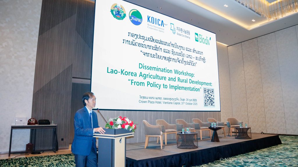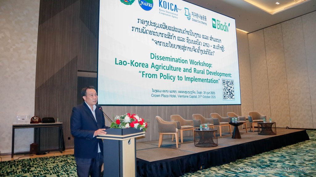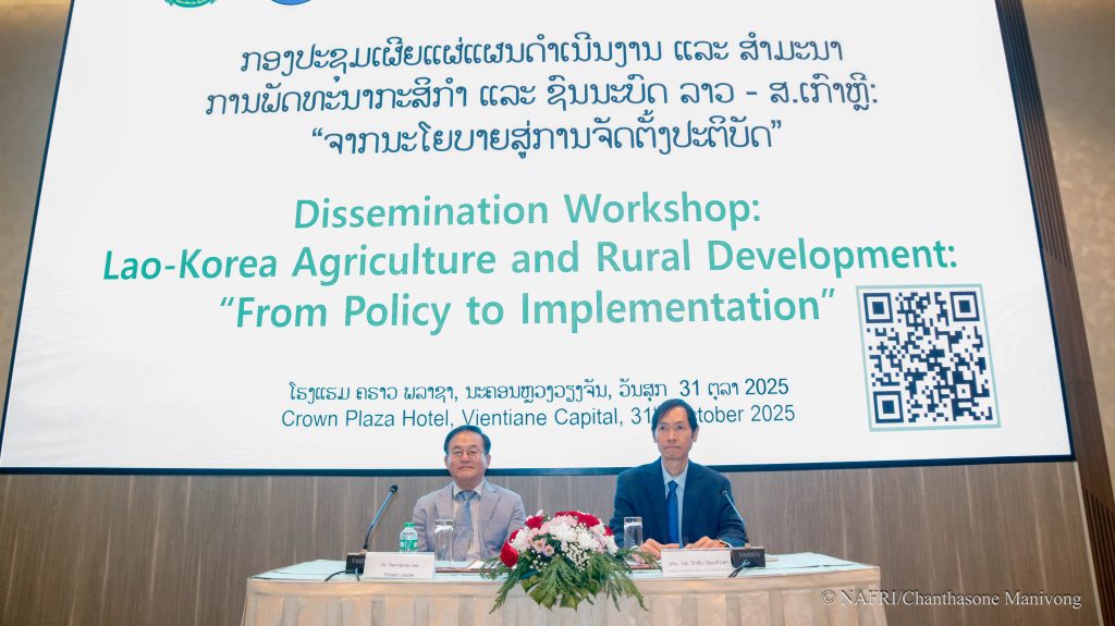 ໃນຄາບເຊົ້າ ຂອງວັນທີ 31 ຕຸລາ 2025, ທີ່ໂຮງແຮມ ຄຣາວ ພລາຊາ, ນະຄອນຫຼວງ ວຽງຈັນ, ສະຖາບັນຄົ້ນຄວ້າ ກະສິກໍາ, ປ່າໄມ້ ແລະ ພັດທະນາຊົນນະບົດ (NAFRI) ຮ່ວມກັບ ອົງການ ຮ່ວມມືສາກົນ ສ.ເກົາຫຼີ (KOICA) ໄດ້ຈັດກອງປະຊຸມເຜີຍແຜ່ແຜນດໍາເນີນງານ ແລະ ສໍາມະນາ ການພັດທະນາກະສິກຳ ແລະ ຊົນນະບົດ ລາວ – ສ.ເກົາຫຼີ: “ຈາກນະໂຍບາຍສູ່ການຈັດຕັ້ງປະຕິບັດ” ໂດຍການເປັນປະທານຮ່ວມ ຂອງທ່ານ ປອ. ໂກສົນ ໄຊພະກັດສາ, ຮອງຫົວໜ້າ ສະຖາບັນຄົ້ນຄວ້າ ກະສິກໍາ, ປ່າໄມ້ ແລະ ພັດທະນາຊົນນະບົດ (NAFRI) ແລະ ທ່ານ ປອ. Seonghee Lee, ຫົວໜ້າໂຄງການຝ່າຍ ສ.ເກົາຫຼີ.